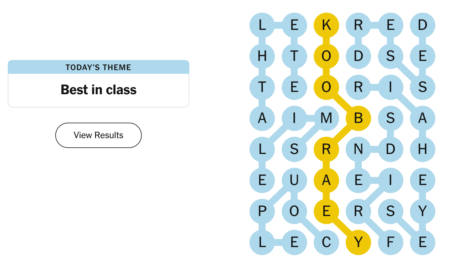 You achieve victory once every letter from the board has been properly placed, which signifies identifying both the pangram and all the theme-related terms. Similar to other New York Times puzzles, after completing this challenge, you'll encounter a sharable graphic showing your performance stats for that particular session: blue circles🔵 denote discovered theme words, a yellow circle 🟡 marks finding the pangram, and a light bulb 💡 highlights instances where hints were utilized.