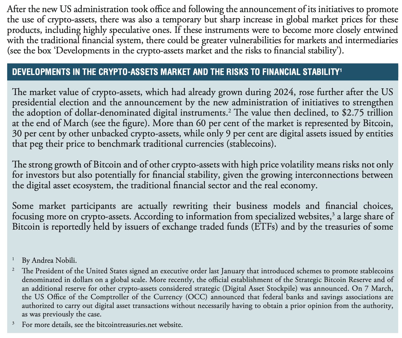 The Bank of Italy highlighted crypto volatility and increasing ties with the overall economy in its April 2025 Financial Stability Report. The report specifically points to stablecoins and thecrypto investments held by non-financial companies as major areas of concern.